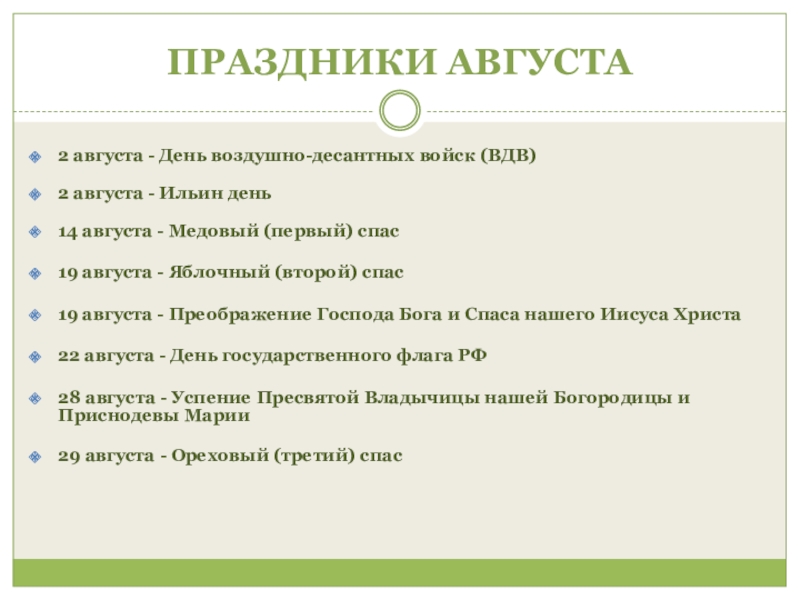 Слайд 7ПРАЗДНИКИ АВГУСТА