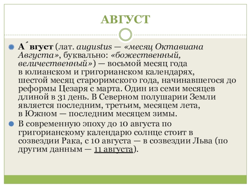 А́вгуст (лат. augustus — «месяц Октавиана Августа», буквально: «божественный, величественный») — восьмой месяц года в юлианском и григорианском календарях, шестой месяц староримского года, начинавшегося до реформы Цезаря с марта.