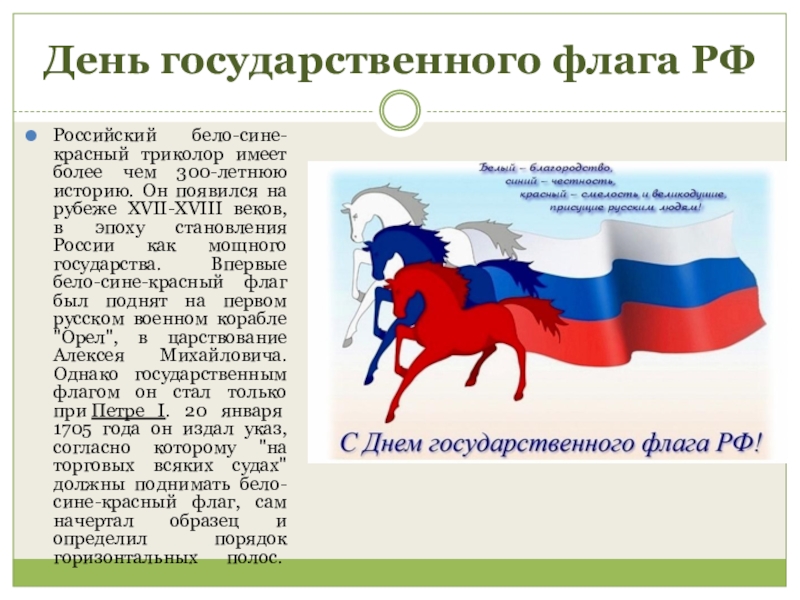 Он появился на рубеже XVII-XVIII веков, в эпоху становления России как мощного государства. Впервые бело-сине-красный флаг был поднят на первом русском военном корабле "Орел", в царствование Алексея Михайловича. Однако государственным флагом он стал только при Петре I. 20 января 1705 года он издал указ, согласно которому "на торговых всяких судах" должны поднимать бело-сине-красный флаг, сам начертал образец и определил порядок горизонтальных полос.