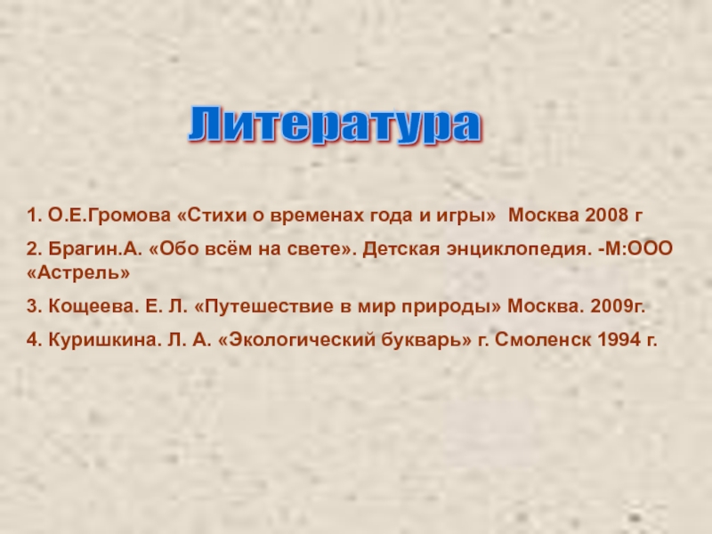 Литература 1. О.Е.Громова «Стихи о временах года и игры» Москва 2008 г 2. Брагин.А. «Обо всём на