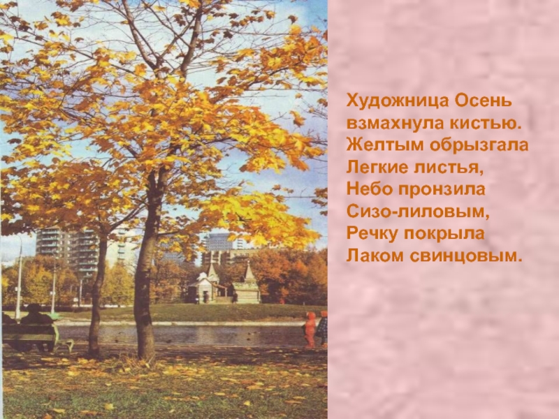 Художница Осень взмахнула кистью.Желтым обрызгала Легкие листья,Небо пронзилаСизо-лиловым,Речку покрылаЛаком свинцовым.