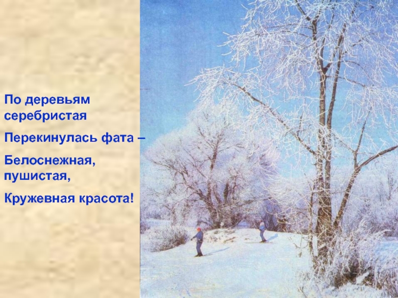 По деревьям серебристаяПерекинулась фата – Белоснежная, пушистая,Кружевная красота!
