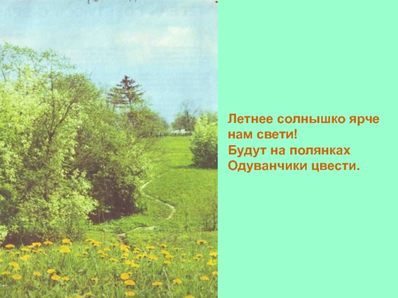 Слайд 8Летнее солнышко ярче нам свети! Будут на полянках Одуванчики цвести.