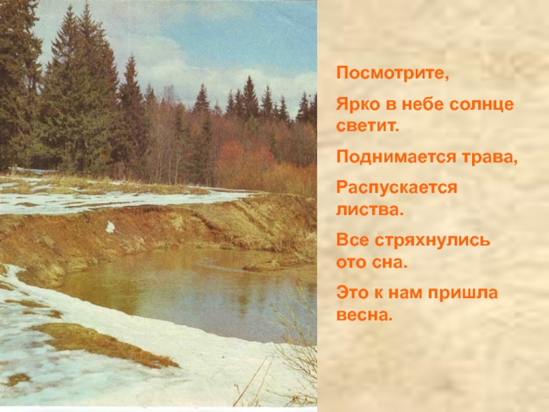 Посмотрите,Ярко в небе солнце светит.Поднимается трава,Распускается листва.Все стряхнулись ото сна.Это к нам пришла весна.