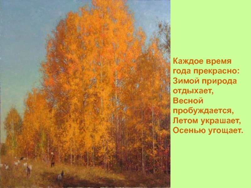 Слайд 13Каждое время года прекрасно: Зимой природа отдыхает, Весной пробуждается, Летом украшает, Осенью угощает.