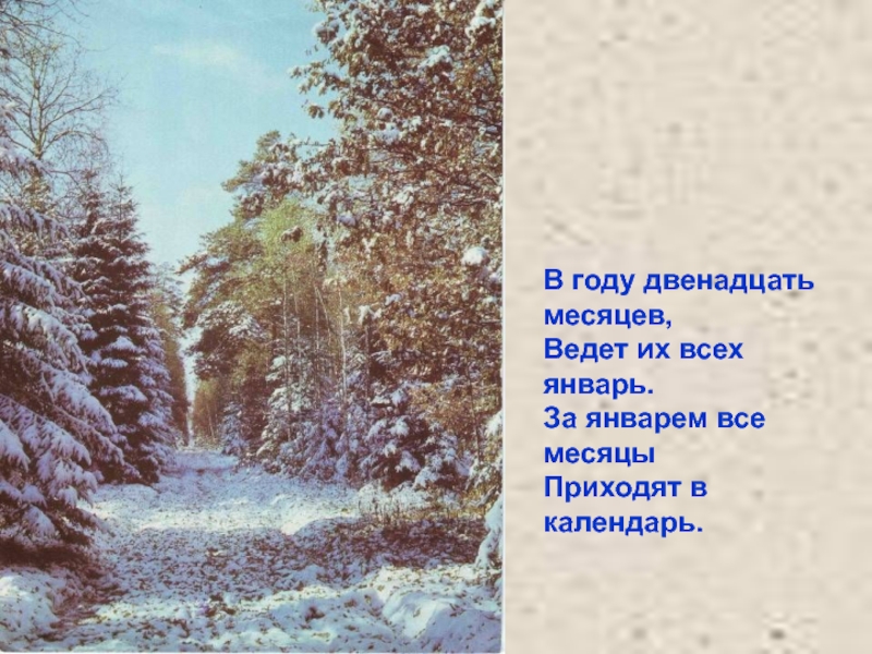 В году двенадцать месяцев,Ведет их всех январь.За январем все месяцыПриходят в календарь.