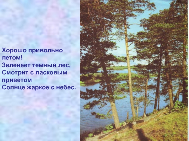 Слайд 10Хорошо привольно летом! Зеленеет темный лес, Смотрит с ласковым приветом Солнце жаркое с небес.