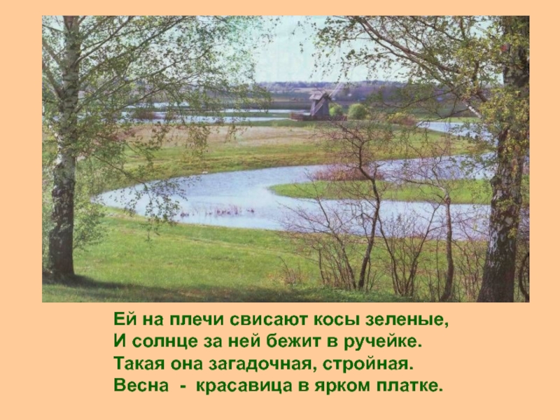 Слайд 7Ей на плечи свисают косы зеленые, И солнце за ней бежит в