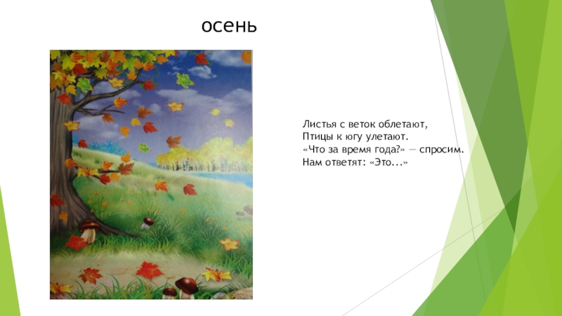 осеньЛистья с веток облетают,Птицы к югу улетают.«Что за время года?» — спросим.Нам ответят: «Это...»