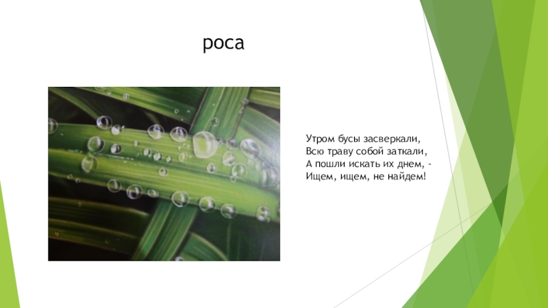 росаУтром бусы засверкали,  Всю траву собой заткали,  А пошли искать их днем, -  Ищем,