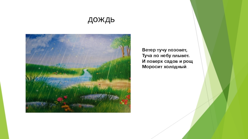 дождьВетер тучу позовет,Туча по небу плывет.И поверх садов и рощМоросит холодный…