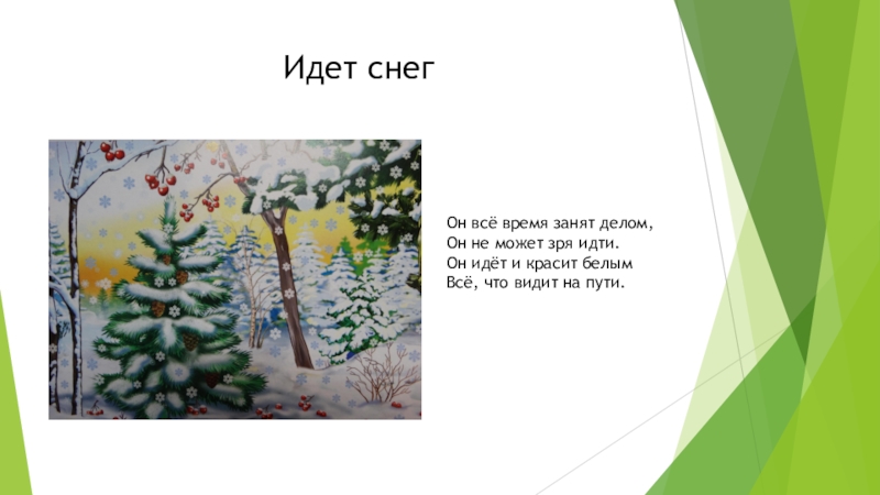 Идет снегОн всё время занят делом, Он не может зря идти. Он идёт и красит белым Всё,