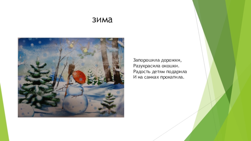 зимаЗапорошила дорожки, Разукрасила окошки. Радость детям подарила И на санках прокатила.