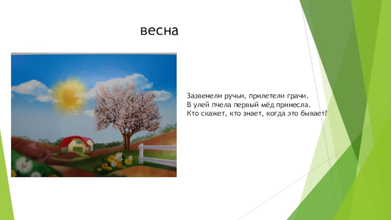 веснаЗазвенели ручьи, прилетели грачи.  В улей пчела первый мёд принесла.  Кто скажет, кто знает, когда