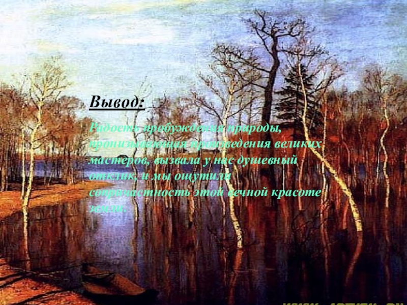 Вывод:Радость пробуждения природы, пронизывающая произведения великих мастеров, вызвала у нас душевный отклик, и мы ощутили сопричастность этой