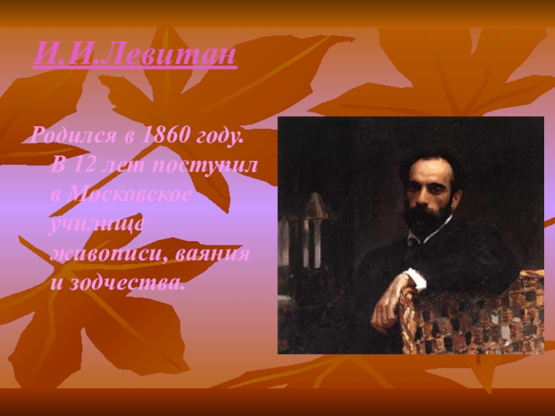 И.И.ЛевитанРодился в 1860 году. В 12 лет поступил в Московское училище живописи, ваяния и зодчества.