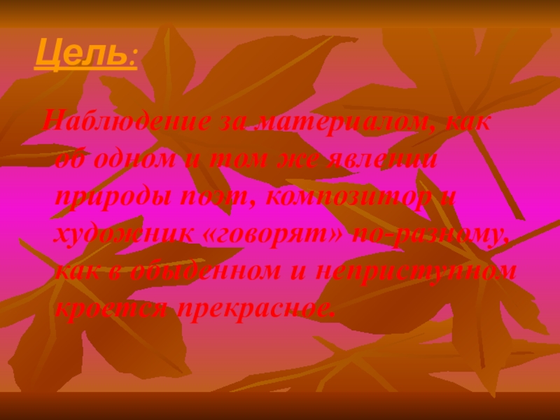 Цель: Наблюдение за материалом, как об одном и том же явлении природы поэт, композитор и художник «говорят» по-разному, как в обыденном и неприступном кроется прекрасное.