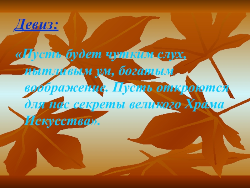 Девиз:«Пусть будет чутким слух, пытливым ум, богатым воображение. Пусть откроются для нас секреты великого Храма Искусства».