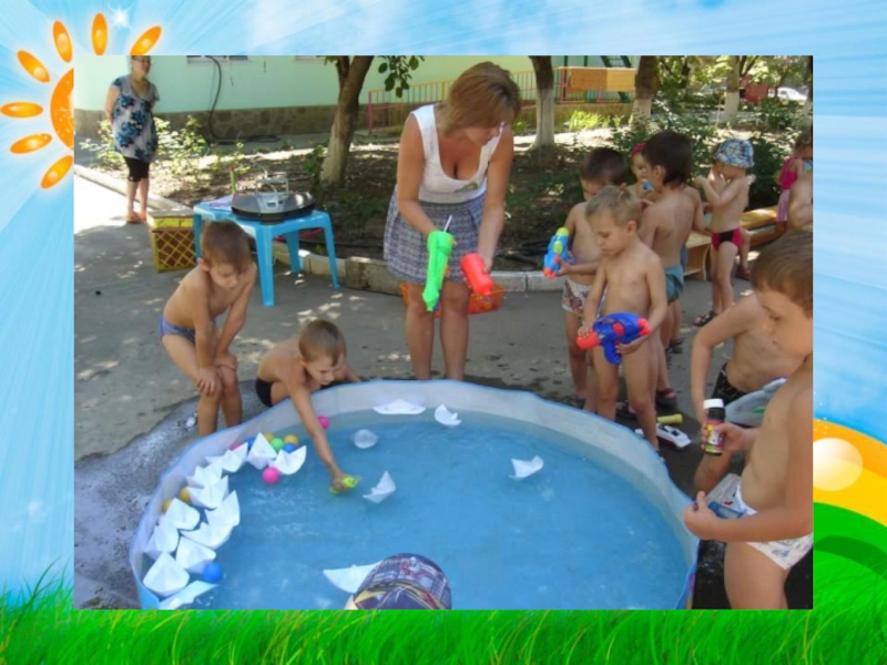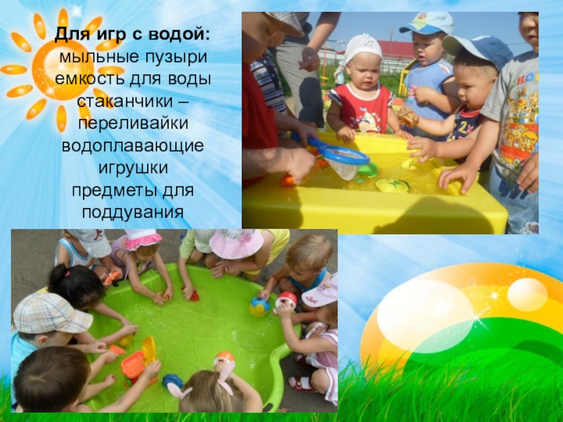 Слайд 9Для игр с водой можно использовать надувной бассейн или тазики, использовать