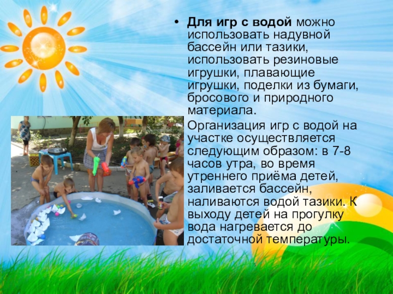 Организация игр с водой на участке осуществляется следующим образом: в 7-8 часов утра, во время утреннего приёма детей, заливается бассейн, наливаются водой тазики. К выходу детей на прогулку вода нагревается до достаточной температуры.