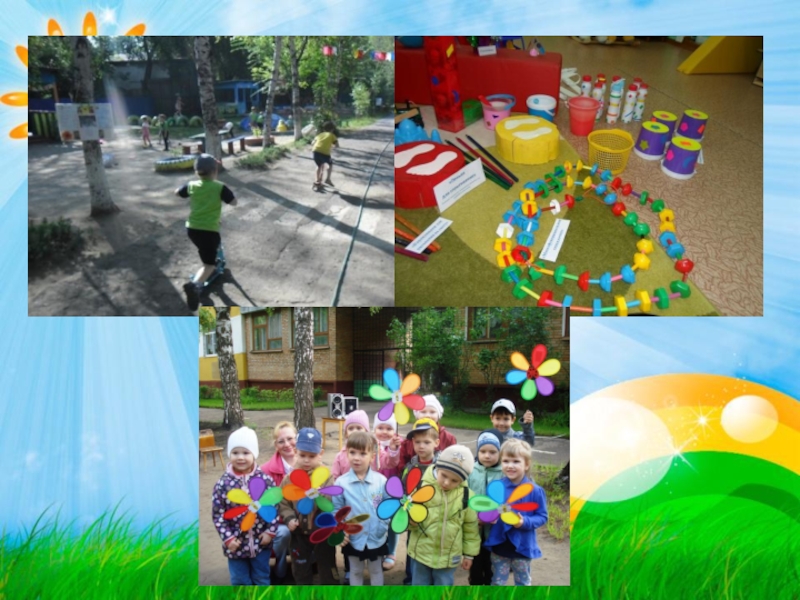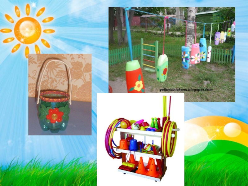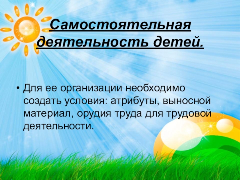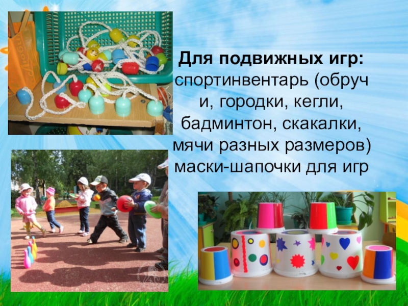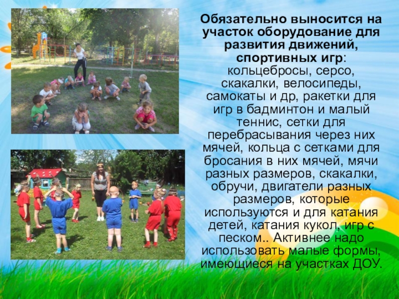Слайд 15Обязательно выносится на участок оборудование для развития движений, спортивных игр: кольцебросы,