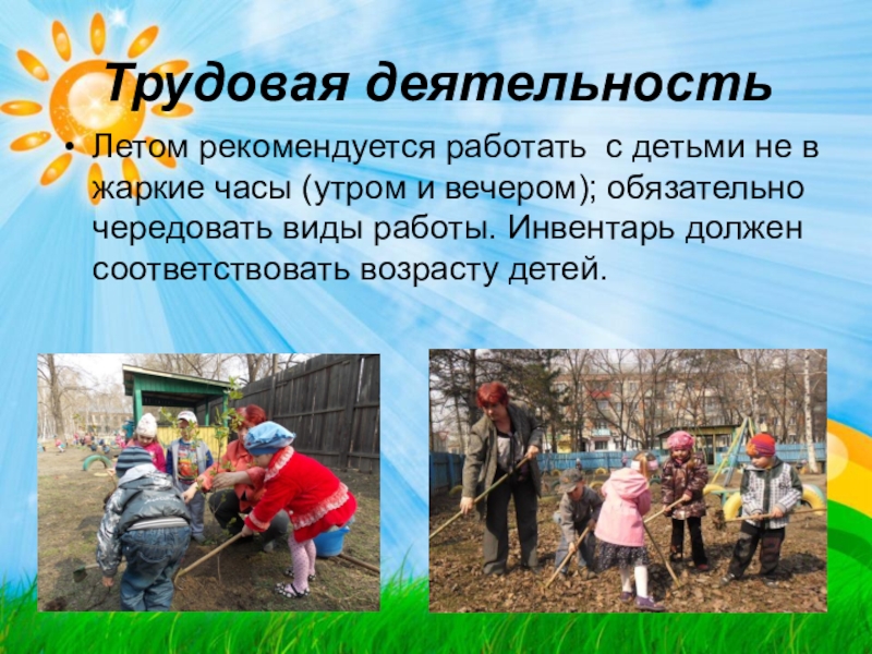 вечером); обязательно чередовать виды работы. Инвентарь должен соответствовать возрасту детей.