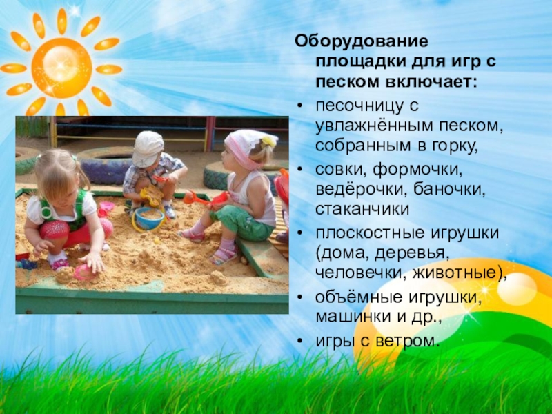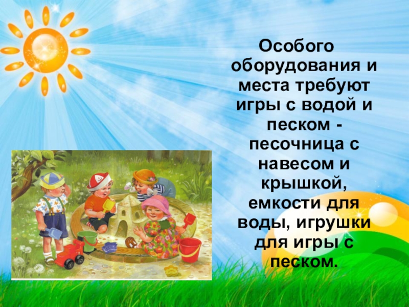 Слайд 6Особого оборудования и места требуют игры с водой и песком -