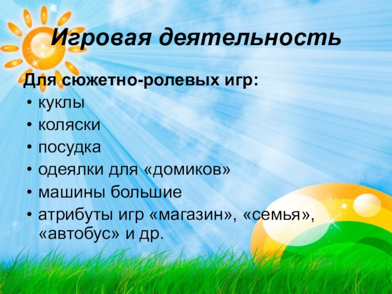 навесами, в домиках. И в каждой игре должны быть свои атрибуты. Они помогут ребенку реализовать свой игровой замысел, отразить в игре жизненные наблюдения, пробуждают и развивают фантазию.