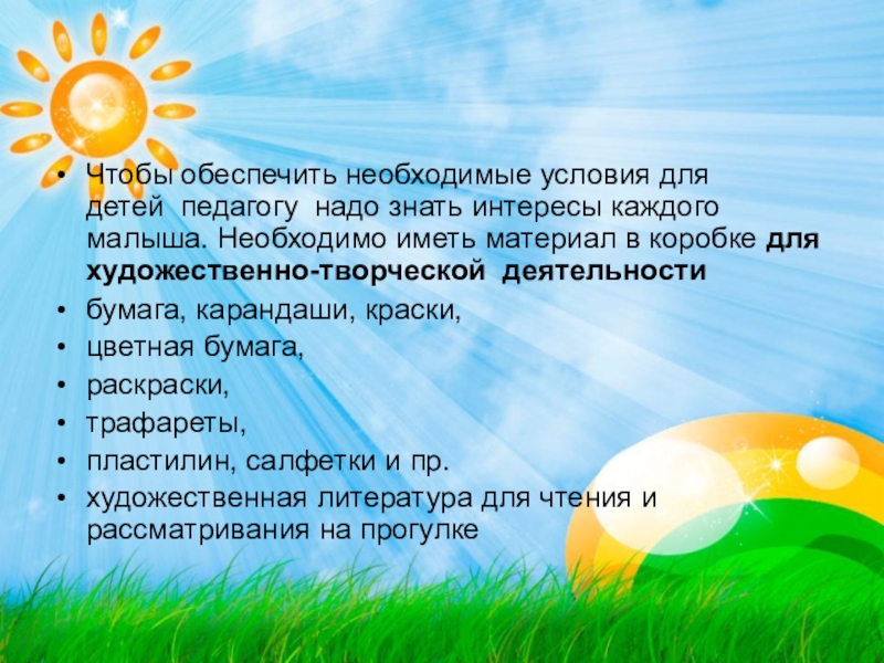 Слайд 21Чтобы обеспечить необходимые условия для детей педагогу надо знать интересы каждого малыша. Необходимо