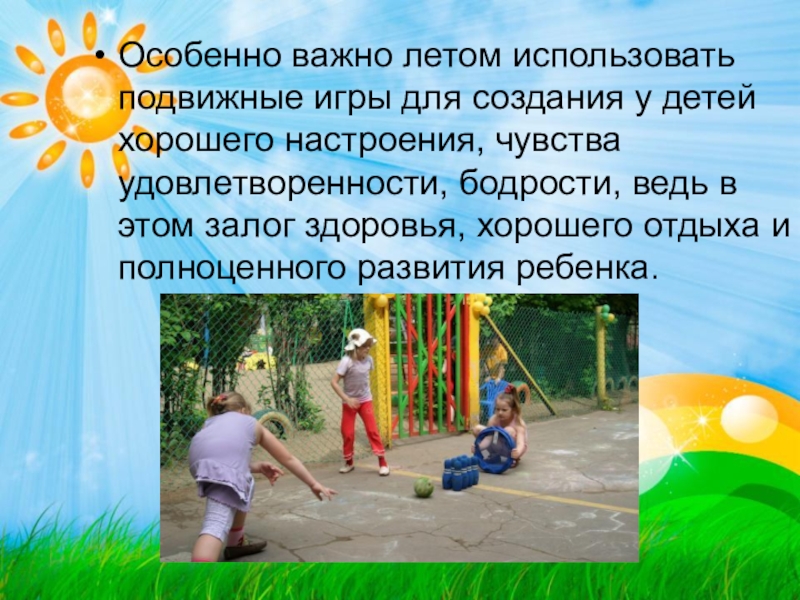 Слайд 12Особенно важно летом использовать подвижные игры для создания у детей хорошего