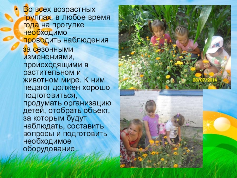 за сезонными изменениями, происходящими в растительном и животном мире. К ним педагог должен хорошо подготовиться, продумать организацию детей, отобрать объект, за которым будут наблюдать, составить вопросы и подготовить необходимое оборудование.