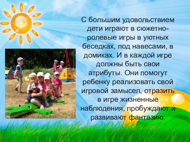 Слайд 3С большим удовольствием дети играют в сюжетно-ролевые игры в уютных беседках, под