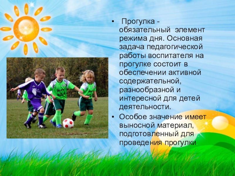 Слайд 2 Прогулка - обязательный элемент режима дня. Основная задача педагогической работы воспитателя на