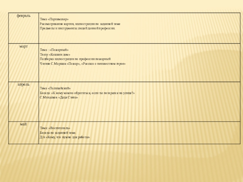 о таких профессиях как врач, парикмахер, повар, полицейский, водитель, пожарный о их трудовых процессах, предметах и орудиях труда. Воспитывать уважение к людям труда, желание трудиться.