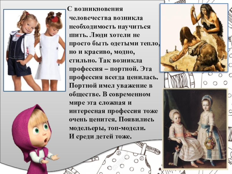 не просто быть одетыми тепло, но и красиво, модно, стильно. Так возникла профессия – портной. Эта профессия всегда ценилась. Портной имел уважение в обществе. В современном мире эта сложная и интересная профессия тоже очень ценится. Появились модельеры, топ-модели.