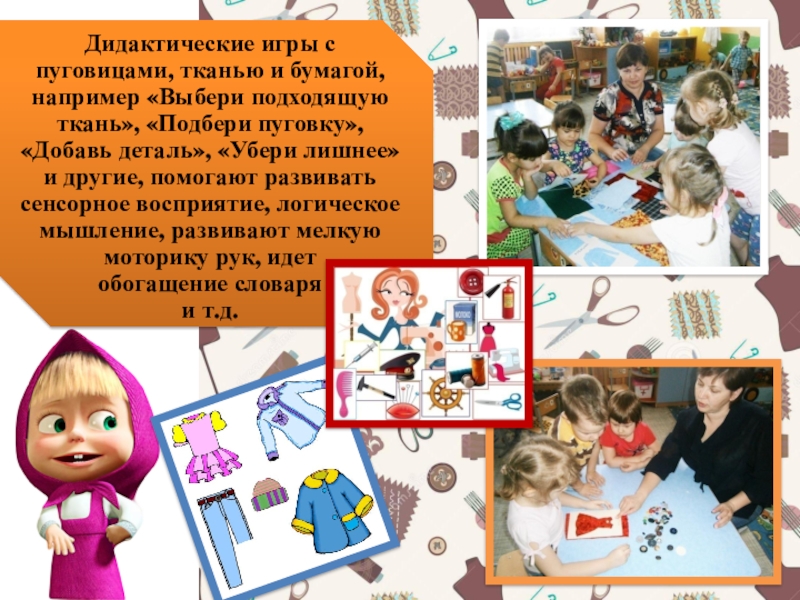 Слайд 7Дидактические игры с пуговицами, тканью и бумагой, например «Выбери подходящую ткань»,