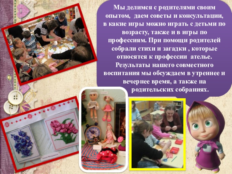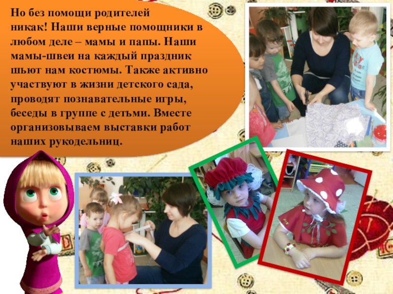 – мамы и папы. Наши мамы-швеи на каждый праздник шьют нам костюмы. Также активно участвуют в жизни детского сада, проводят познавательные игры, беседы в группе с детьми. Вместе организовываем выставки работ наших рукодельниц.
