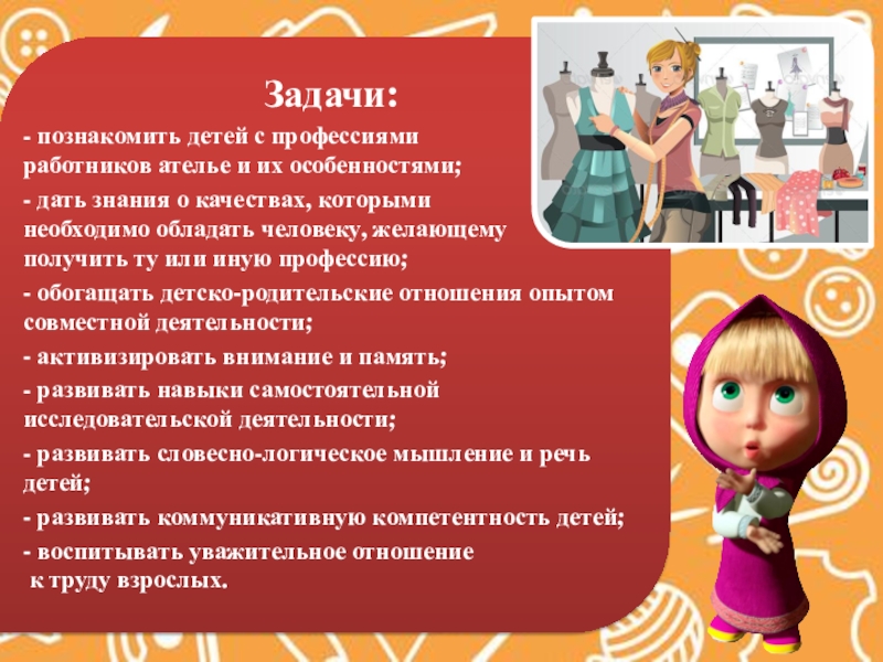 какие игры можно играть с детьми по возрасту, также и в игры по профессиям. При помощи родителей собрали стихи и загадки , которые относятся к профессии ателье. Результаты нашего совместного воспитания мы обсуждаем в утреннее и вечернее время, а также на