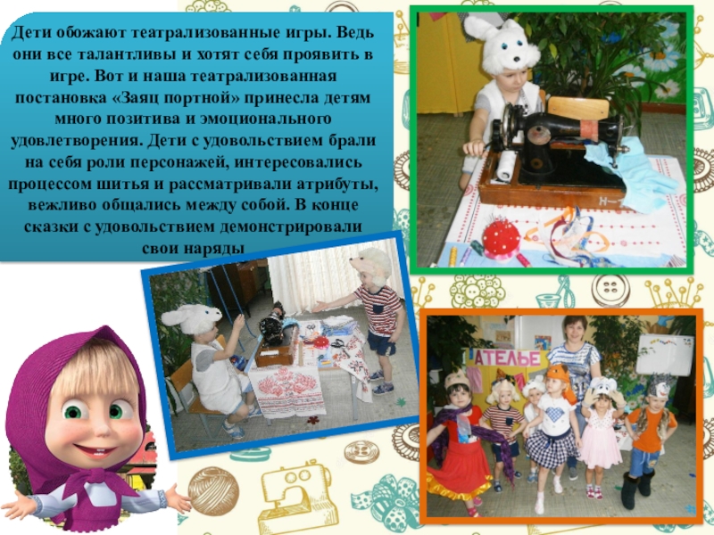 проявить в игре. Вот и наша театрализованная постановка «Заяц портной» принесла детям много позитива и эмоционального удовлетворения. Дети с удовольствием брали на себя роли персонажей, интересовались процессом шитья и рассматривали атрибуты, вежливо общались между собой. В конце сказки с удовольствием демонстрировали свои наряды