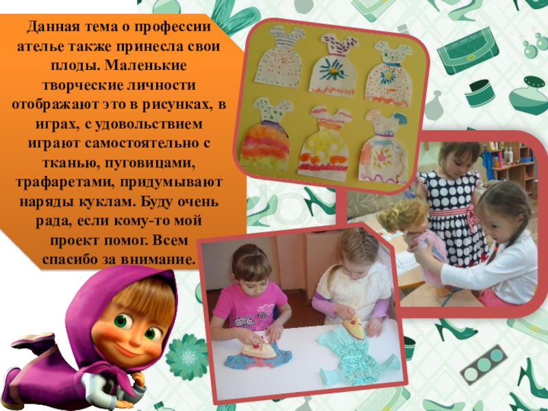 Слайд 12Данная тема о профессии ателье также принесла свои плоды. Маленькие творческие