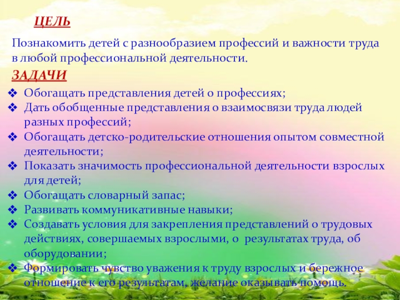 Показать значимость профессиональной деятельности взрослых для детей;
