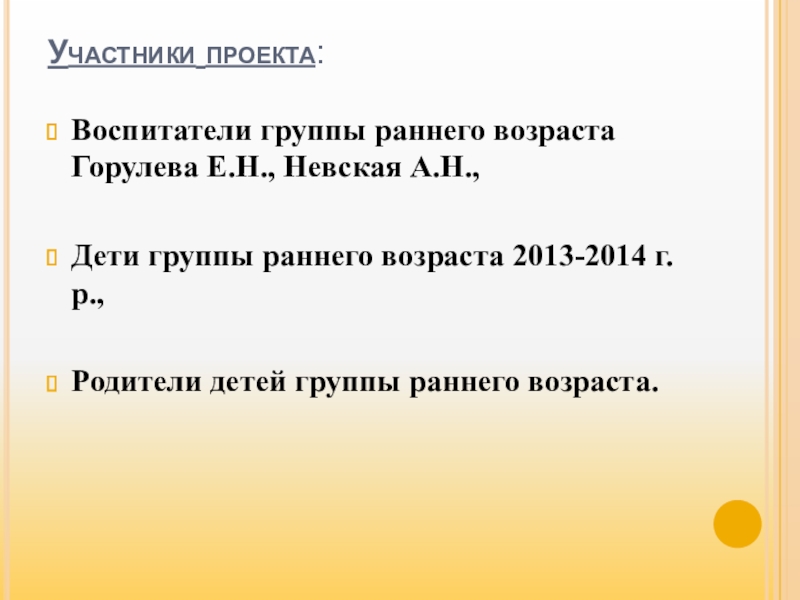 Участники проекта:Воспитатели группы раннего возраста Горулева Е.Н., Невская А.Н.,Дети группы раннего возраста 2013-2014 г.р.,Родители детей группы раннего