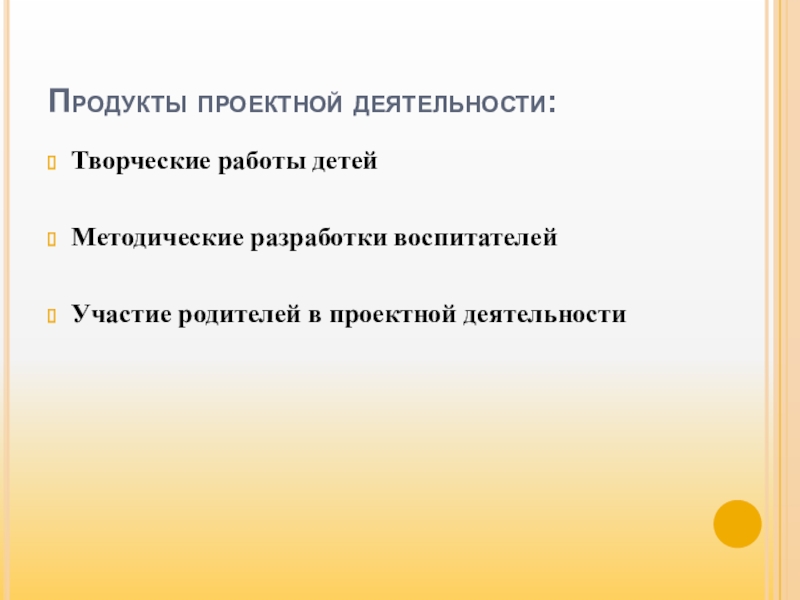 Продукты проектной деятельности:Творческие работы детейМетодические разработки воспитателейУчастие родителей в проектной деятельности