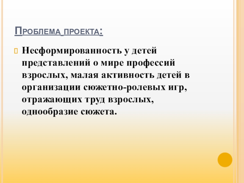 Проблема проекта:  Несформированность у детей представлений о мире профессий взрослых, малая активность детей в организации сюжетно-ролевых игр, отражающих труд взрослых, однообразие сюжета.
