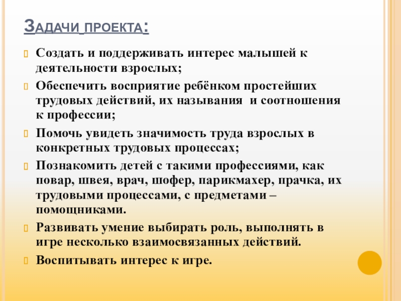 Задачи проекта: Создать и поддерживать интерес малышей к деятельности взрослых;Обеспечить восприятие ребёнком простейших трудовых действий, их называния
