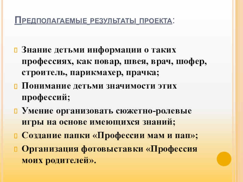 Предполагаемые результаты проекта: Знание детьми информации о таких профессиях, как повар, швея, врач, шофер,строитель, парикмахер, прачка;Понимание детьми