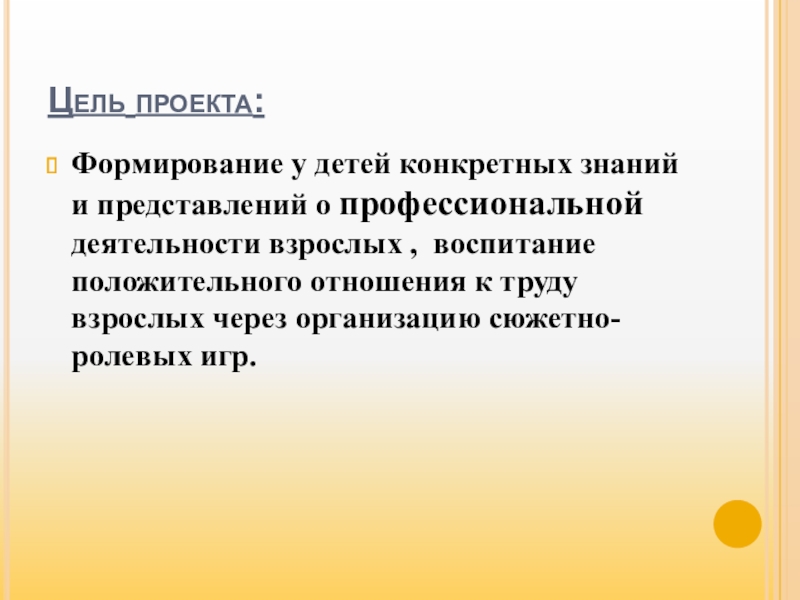Цель проекта: Формирование у детей конкретных знаний и представлений о профессиональной деятельности взрослых , воспитание положительного отношения
