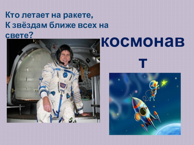 Кто летает на ракете,К звёздам ближе всех на свете?космонавт