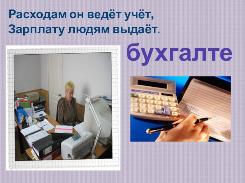Расходам он ведёт учёт,Зарплату людям выдаёт.бухгалтер
