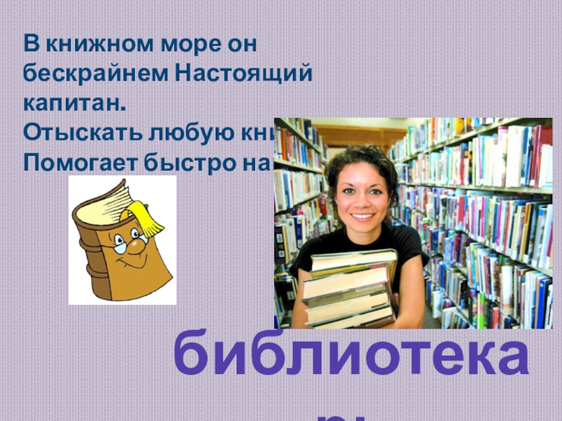В книжном море он бескрайнем Настоящий капитан.Отыскать любую книжкуПомогает быстро нам.библиотекарь
